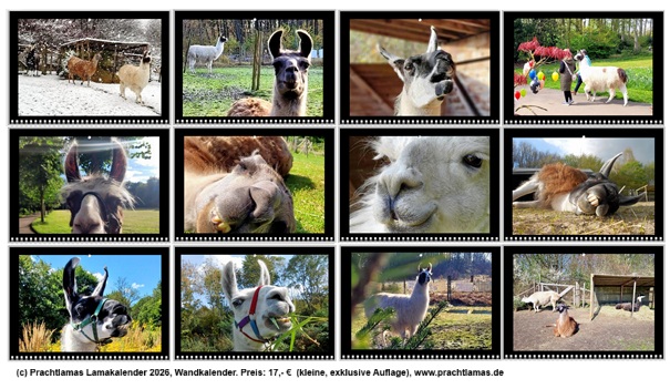 Wir freuen uns, Ihnen den neuen “Lamakalender 2026” hier vorzustellen! Der Wandkalender ist in kleiner Auflage gedruckt worden, also sehr exklusiv. Erfreuen Sie sich ein ganzes Jahr an unseren “Prachtlamas”.